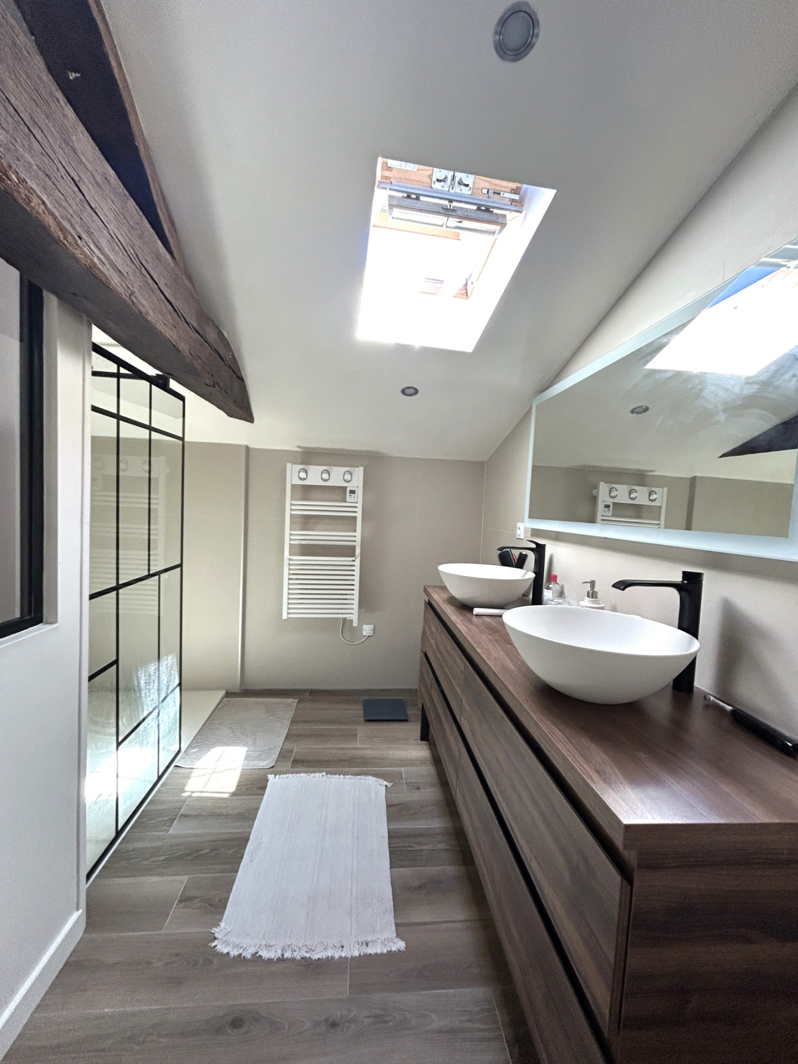 Répartie sur trois niveaux, elle allie charme et confort notamment grâce à son plancher et ses poutres.