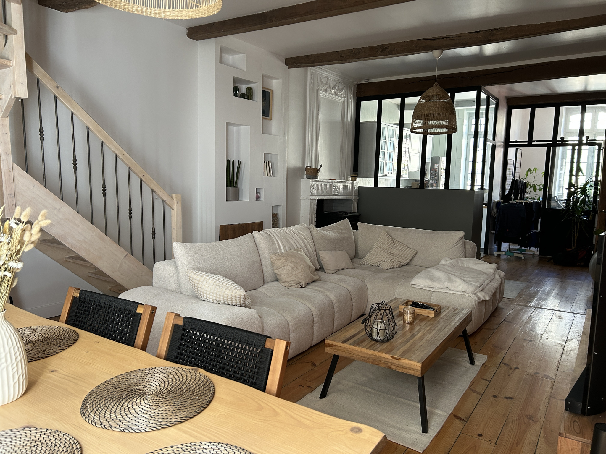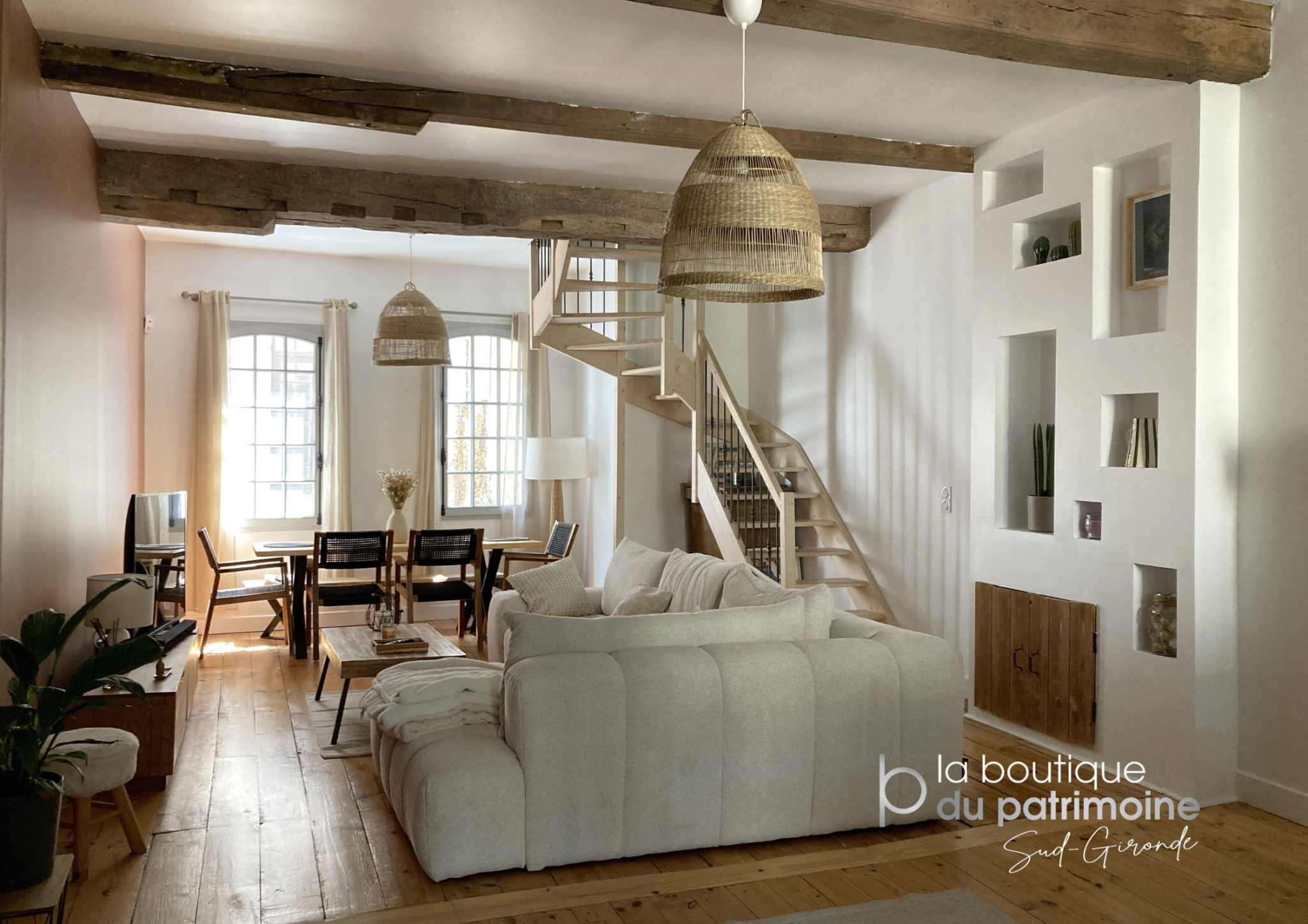 Bazas (33430)En plein centre de Bazas, à deux pas de la place de la Cathédrale et de ses restaurants, découvrez cette maison de ville de 113m² à l’ambiance chaleureuse et actuelle parfaite pour poser vos valises sans prévoir de travaux.