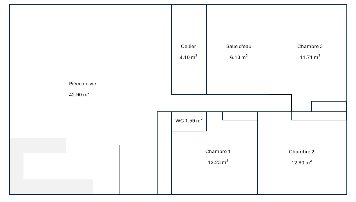 Elle se compose d'une entrée avec placard, d'une pièce de vie lumineuse de 42,90 m² avec cuisine ouverte, de 3 chambres, d'une salle d'eau, d'un WC et d'une buanderie.