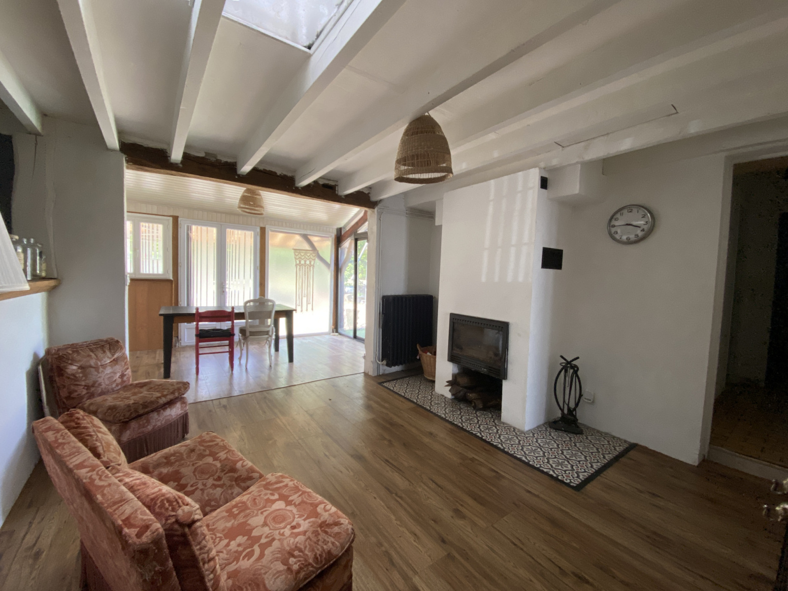L’entrée spacieuse mène sur la pièce de vie principale où se trouve la cuisine ouverte sur un séjour avec insert et une véranda donnant sur le jardin.