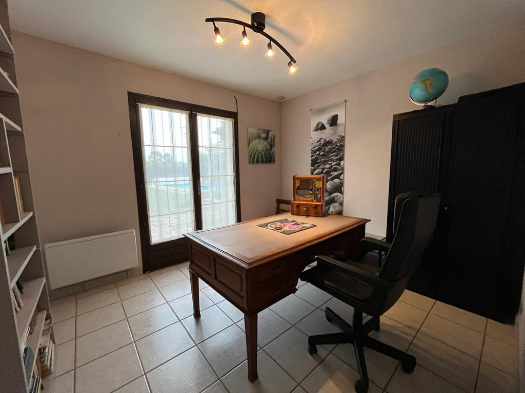 Aussi vous disposerez d'une cuisine avec une grande baie vitrée et vue sur un parc arboré, 4 chambres dont une avec salle d'eau, une salle de bain, un wc et un cellier.