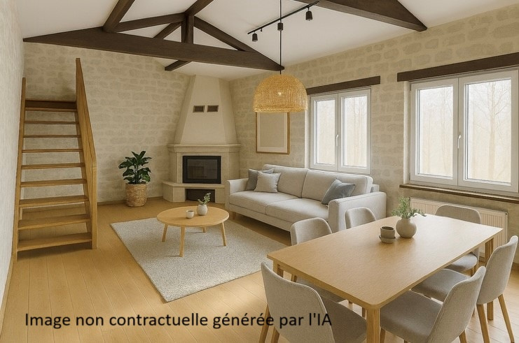 - Un séjour lumineux avec poutres apparentes, murs en pierre et belle hauteur sous plafond, le tout agrémenté d'une cheminée insert pour des soirées cocooning.