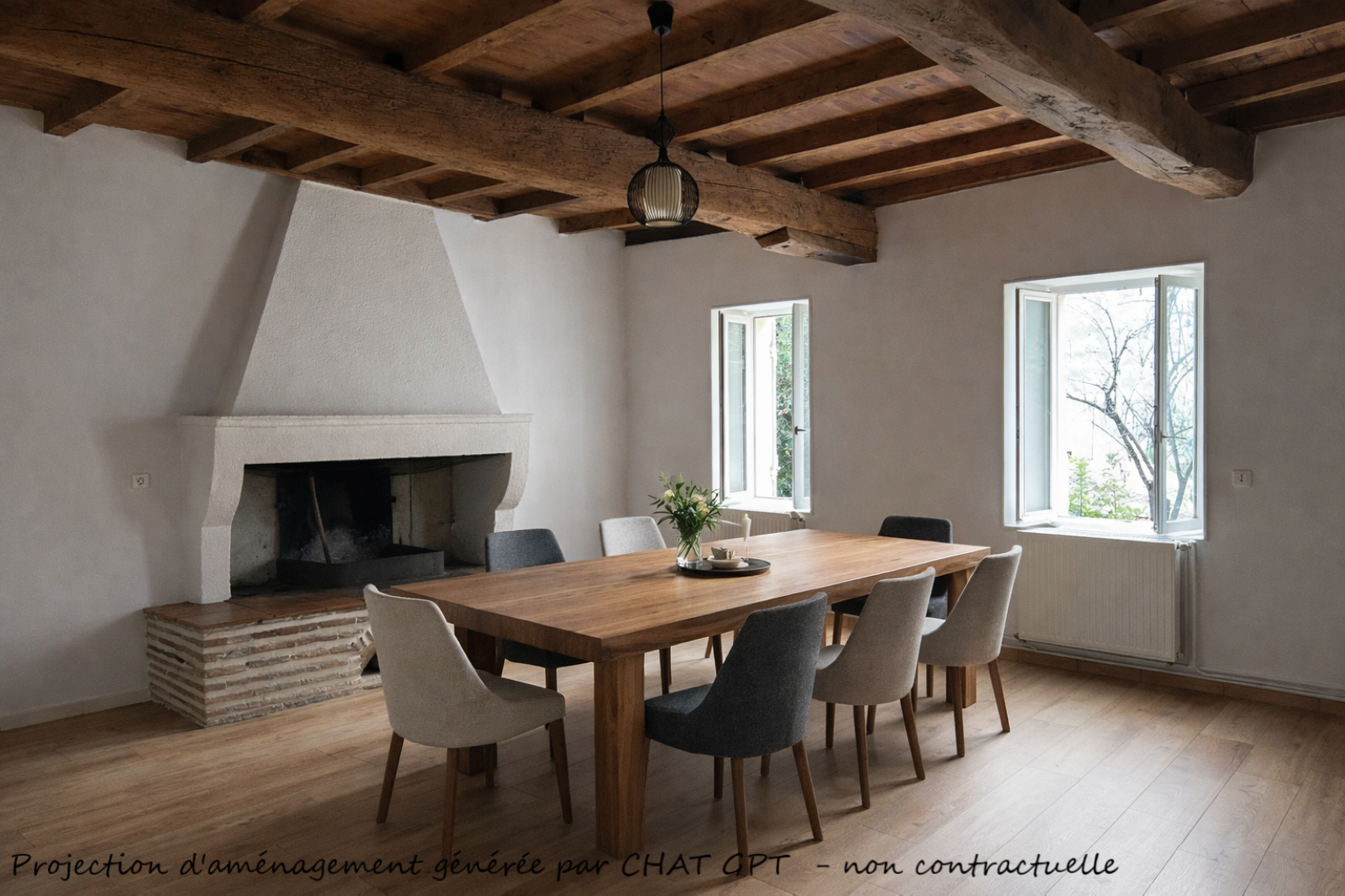 Elle se compose au rez-de-chaussée d'une entrée, un séjour avec une belle cheminée et des poutres apparentes, une grande cuisine, 3 chambres, une salle de bain spacieuse et une salle d'eau.