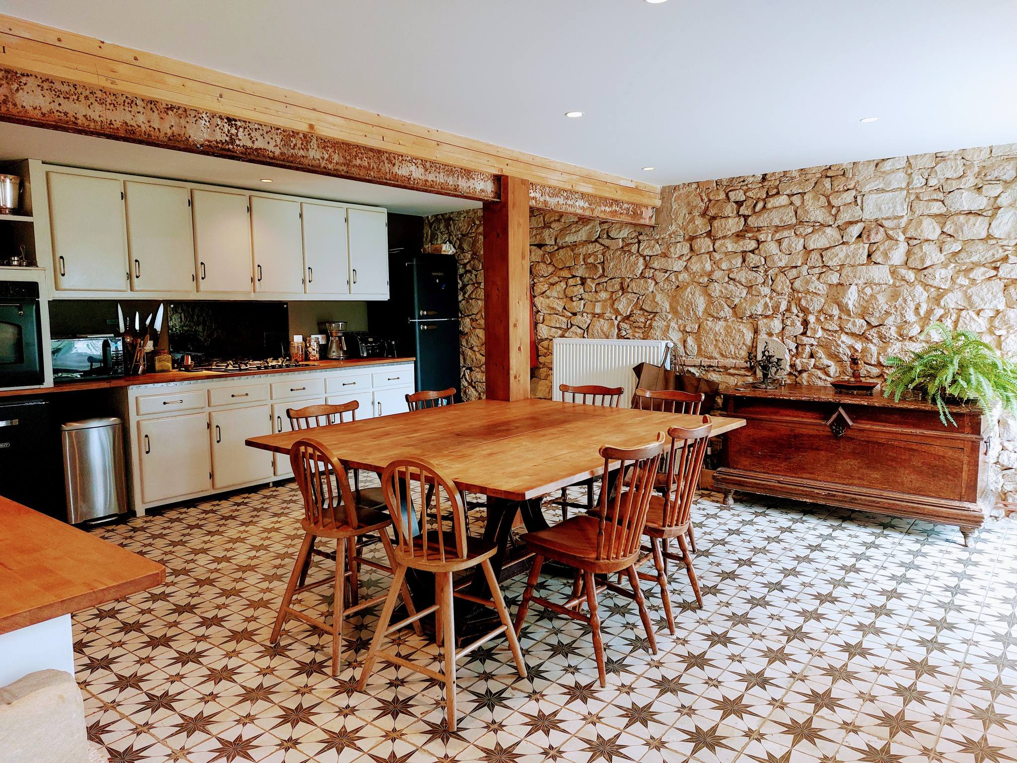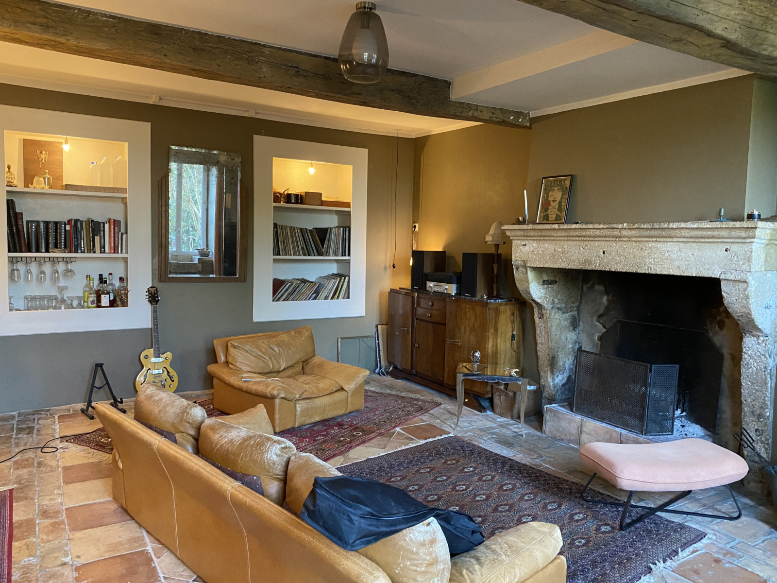 - Un second salon avec carreaux de gironde et cheminée en pierre
