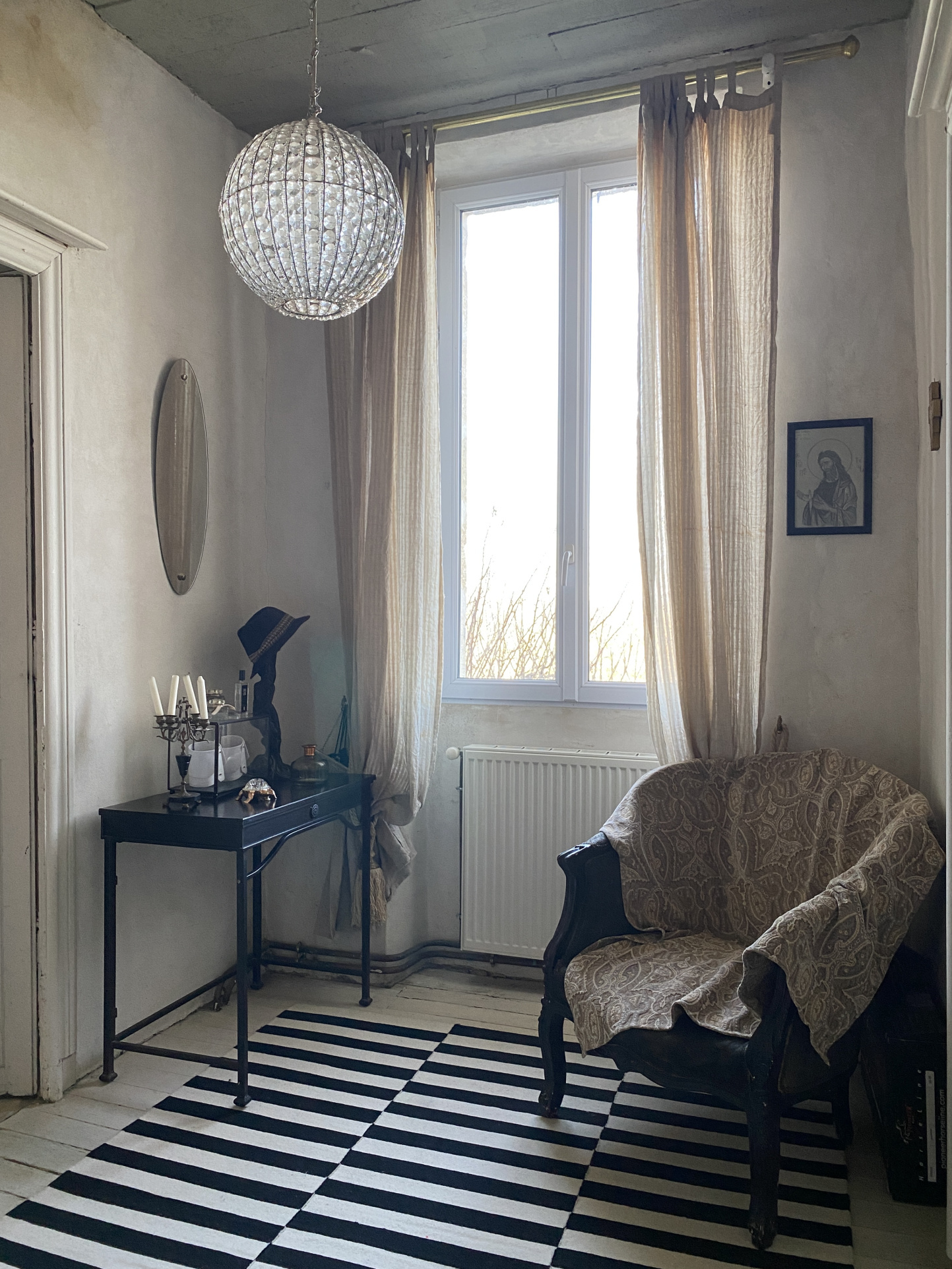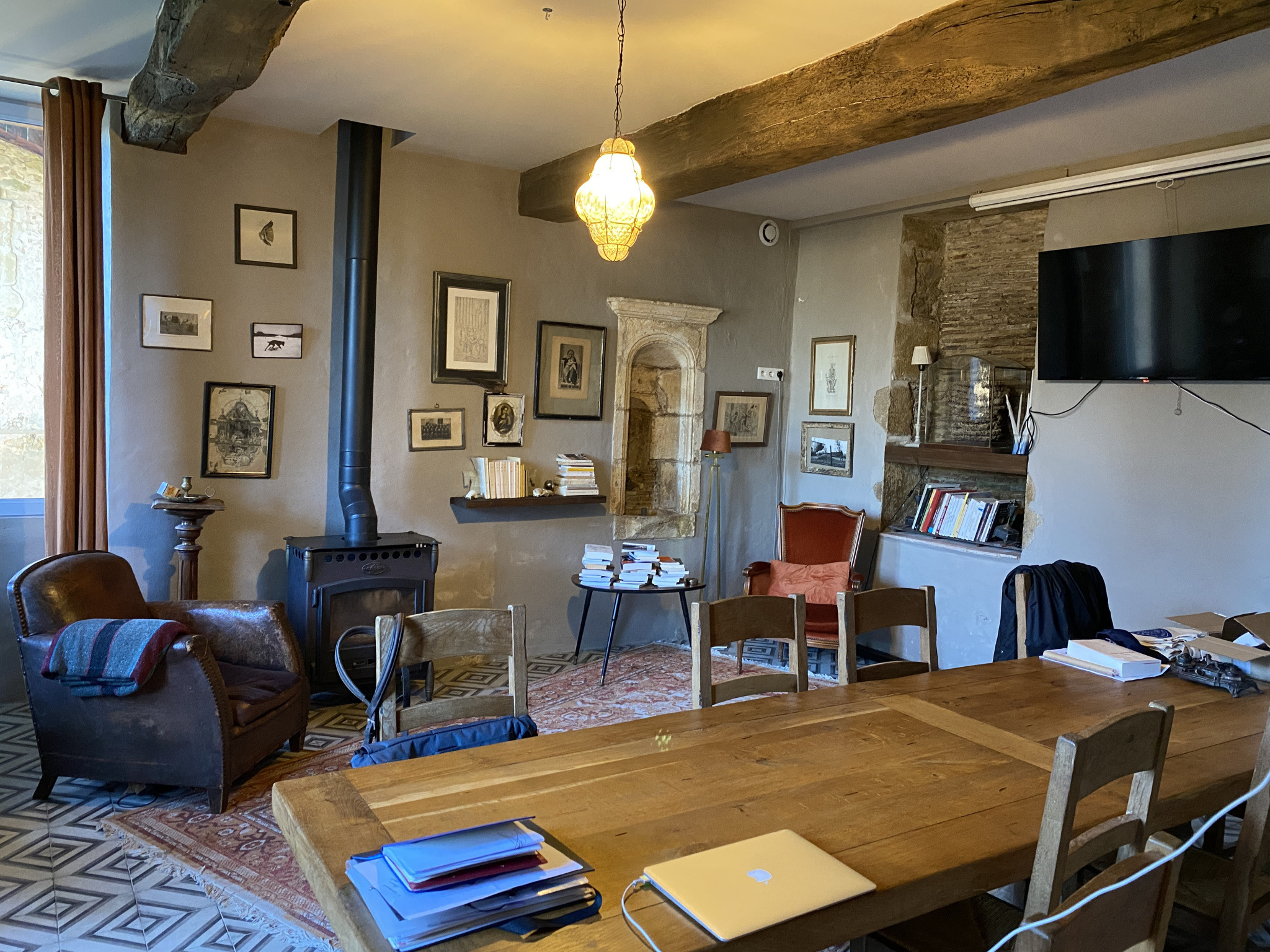 - Un salon avec carreaux de ciment et poêle à bois