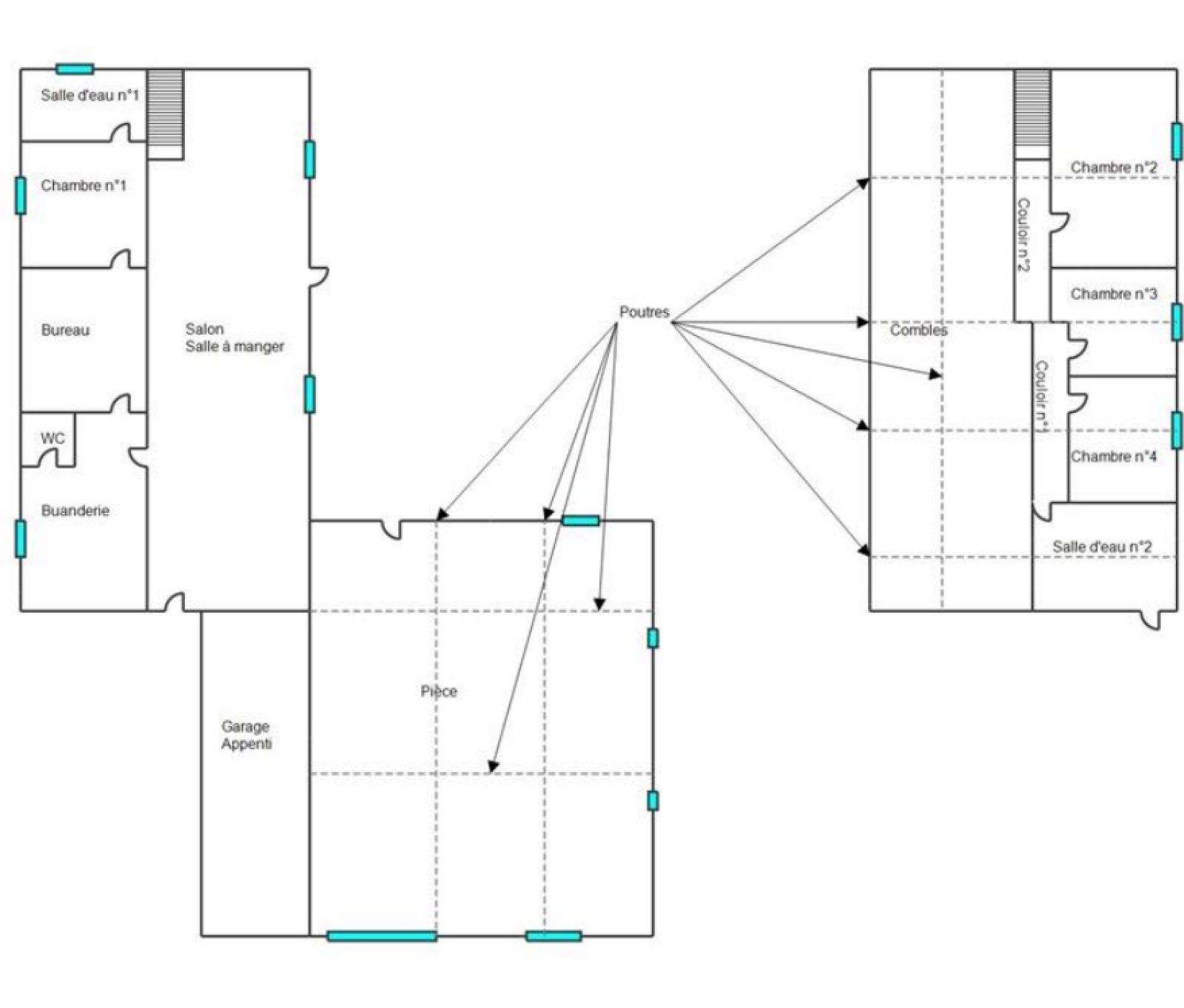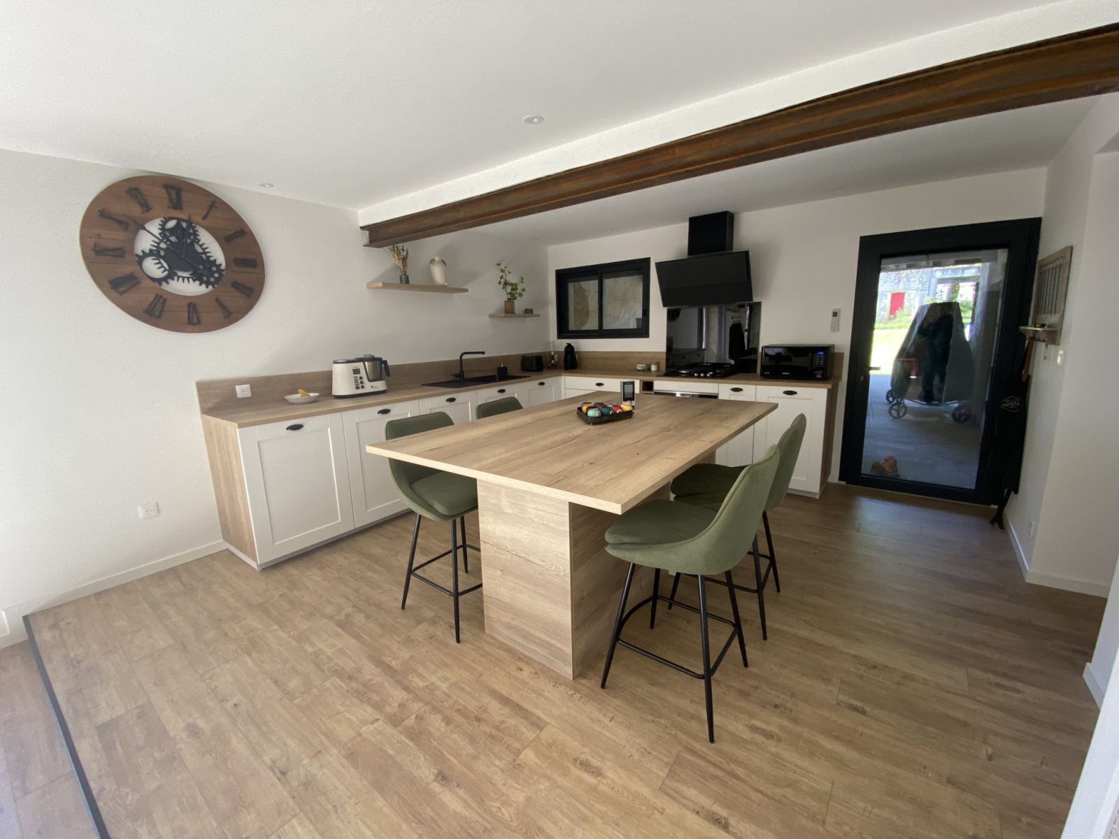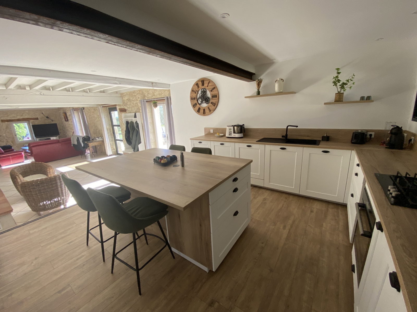 La maison principale se compose au rez-de-chaussée d'un séjour avec cuisine ouverte (2025), d'un espace bureau et d'une chambre avec sa propre salle d'eau. A l'étage, vous trouverez une seconde salle d'eau avec WC et 3 chambres supplémentaires dont une avec son propre dressing.
