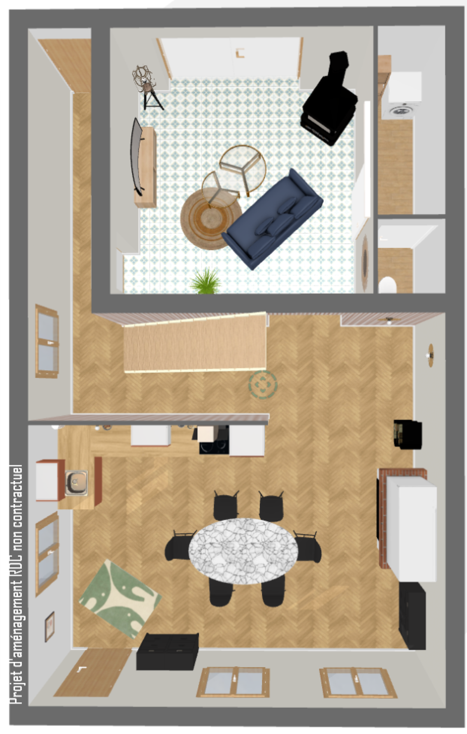 Au rez-de-chaussée, vous trouverez une agréable cour de 32 m², une entrée, un salon, une salle à manger, une cuisine, un cellier et des toilettes.